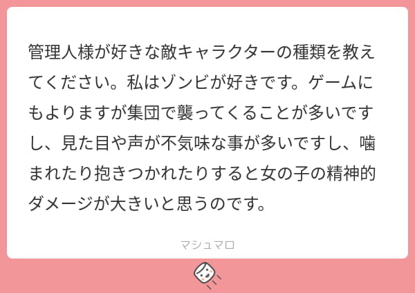 管理人様が好きな敵キャラクターの種類を教えてください。私はゾンビが好きです。ゲームにもよりますが集団で襲ってくることが多いですし、見た目や声が不気味な事が多いですし、噛まれたり抱きつかれたりすると女の子の精神的ダメージが大きいと思うのです。
