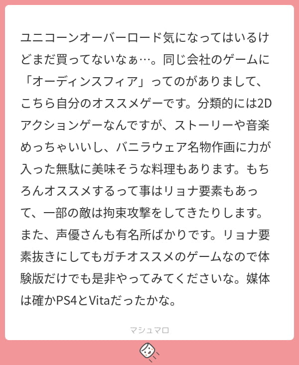 ユニコーンオーバーロード気になってはいるけどまだ買ってないなぁ…。同じ会社のゲームに「オーディンスフィア」ってのがありまして、こちら自分のオススメゲーです。分類的には2Dアクションゲーなんですが、ストーリーや音楽めっちゃいいし、バニラウェア名物作画に力が入った無駄に美味そうな料理もあります。もちろんオススメするって事はリョナ要素もあって、一部の敵は拘束攻撃をしてきたりします。また、声優さんも有名所ばかりです。リョナ要素抜きにしてもガチオススメのゲームなので体験版だけでも是非やってみてくださいな。媒体は確かPS4とVitaだったかな。