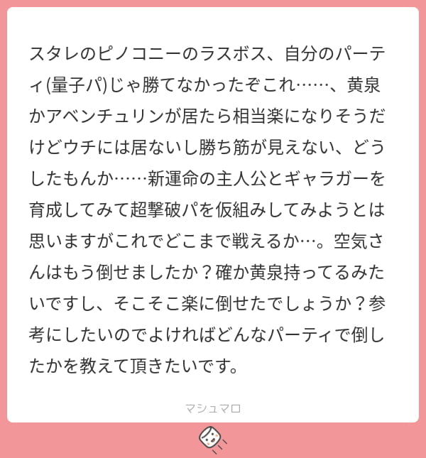 スタレのピノコニーのラスボス、自分のパーティ(量子パ)じゃ勝てなかったぞこれ……、黄泉かアベンチュリンが居たら相当楽になりそうだけどウチには居ないし勝ち筋が見えない、どうしたもんか……新運命の主人公とギャラガーを育成してみて超撃破パを仮組みしてみようとは思いますがこれでどこまで戦えるか…。空気さんはもう倒せましたか?確か黄泉持ってるみたいですし、そこそこ楽に倒せたでしょうか?参考にしたいのでよければどんなパーティで倒したかを教えて頂きたいです。