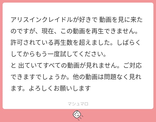 アリスインクレイドルが好きで 動画を見に来たのですが、現在、この動画を再生できません。許可されている再生数を超えました。しばらくしてからもう一度試してください。