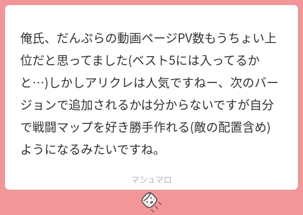 俺氏、だんぷらの動画ページPV数もうちょい上位だと思ってました(ベスト5には入ってるかと…)しかしアリクレは人気ですねー、次のバージョンで追加されるかは分からないですが自分で戦闘マップを好き勝手作れる(敵の配置含め)ようになるみたいですね。