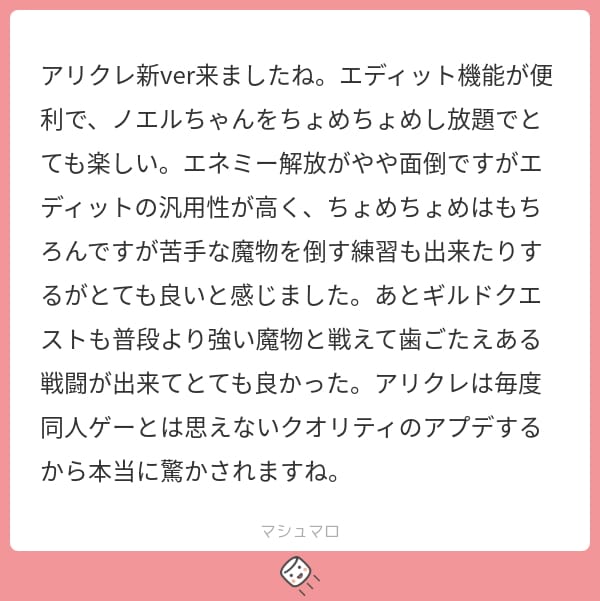 アリクレ新ver来ましたね。エディット機能が便利で、ノエルちゃんをちょめちょめし放題でとても楽しい。エネミー解放がやや面倒ですがエディットの汎用性が高く、ちょめちょめはもちろんですが苦手な魔物を倒す練習も出来たりするがとても良いと感じました。あとギルドクエストも普段より強い魔物と戦えて歯ごたえある戦闘が出来てとても良かった。アリクレは毎度同人ゲーとは思えないクオリティのアプデするから本当に驚かされますね。