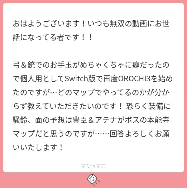 弓&銃でのお手玉がめちゃくちゃに癖だったので個人用としてSwitch版で再度OROCHI3を始めたのですが…どのマップでやってるのかが分からず教えていただきたいのです! 恐らく装備に騒鈴、面の予想は豊臣&アテナがボスの本能寺マップだと思うのですが……回答よろしくお願いいたします!