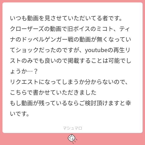クローザーズの動画で旧ボイスのミコト、ティナのドッペルゲンガー戦の動画が無くなっていてショックだったのですが、youtubeの再生リストのみでも良いので掲載することは可能でしょうか…?