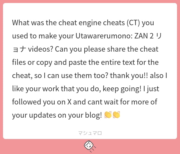 What was the cheat engine cheats (CT) you used to make your Utawarerumono: ZAN 2 リョナ videos? Can you please share the cheat files or copy and paste the entire text for the cheat, so I can use them too? thank you!! also I like your work that you do, keep going! I just followed you on X and cant wait for more of your updates on your blog!