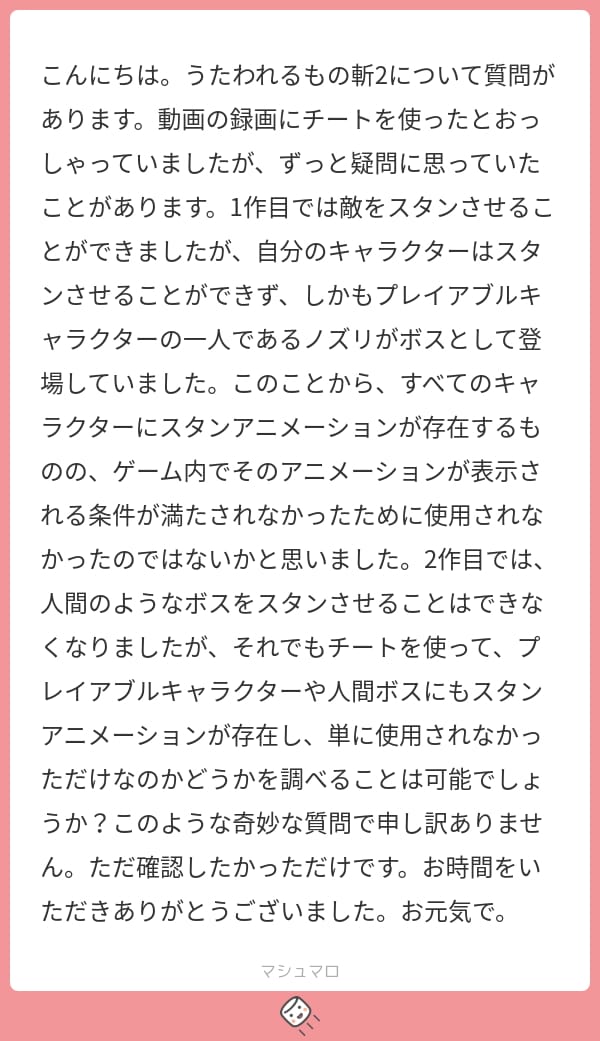 こんにちは。うたわれるもの斬2について質問があります。動画の録画にチートを使ったとおっしゃっていましたが、ずっと疑問に思っていたことがあります。1作目では敵をスタンさせることができましたが、自分のキャラクターはスタンさせることができず、しかもプレイアブルキャラクターの一人であるノズリがボスとして登場していました。このことから、すべてのキャラクターにスタンアニメーションが存在するものの、ゲーム内でそのアニメーションが表示される条件が満たされなかったために使用されなかったのではないかと思いました。2作目では、人間のようなボスをスタンさせることはできなくなりましたが、それでもチートを使って、プレイアブルキャラクターや人間ボスにもスタンアニメーションが存在し、単に使用されなかっただけなのかどうかを調べることは可能でしょうか?このような奇妙な質問で申し訳ありません。ただ確認したかっただけです。お時間をいただきありがとうございました。お元気で。